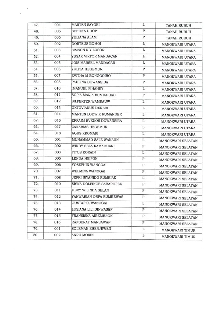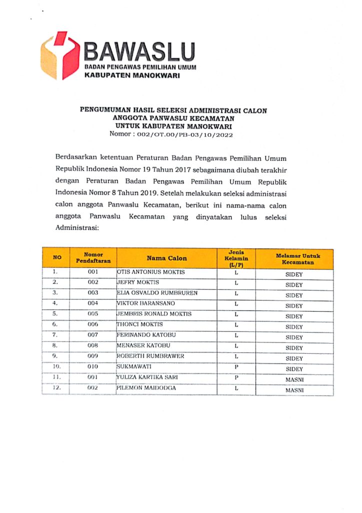\n\n\n\nBerikut kami sampaikan hasil seleksi administrasi calon anggota Panwaslu kecamatan Kabupaten Manokwari