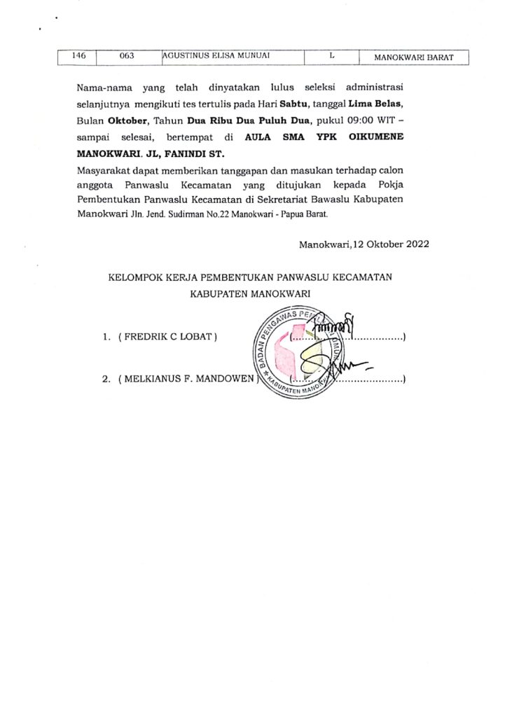 \n\n\n\nDan kami mengucapkan selamat kepada sahabat Bawaslu yang dinyatakan lulus seleksi administrasi, selanjutnya mengikuti tes pada hari Sabtu, tanggal 15 Oktober 2022, bertempat di AULA SMA YPK OIKUMENE MANOKWARI. JL, FANINDI ST